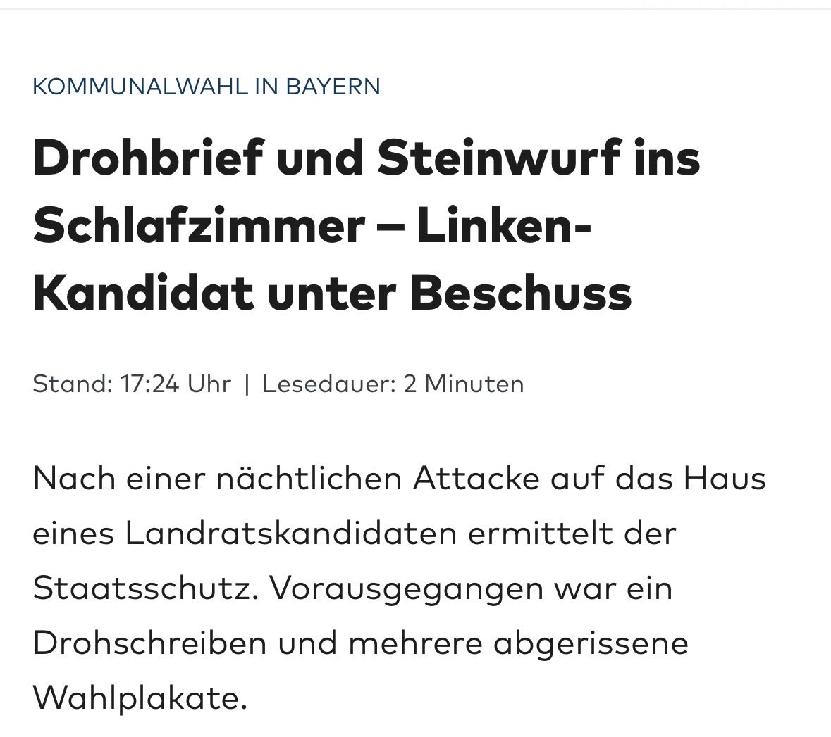 Drohbriefe, Einschüchterung, ein Stein durchs Fenster – das ist der rechte Terror, der Angst schüren und Menschen mundtot machen soll. Viel Kraft unserem linken Landratskandidaten in Bayern. Danke für dein tägliches Engagement, lieber Simon. Niemals alleine, immer gemeinsam ✊