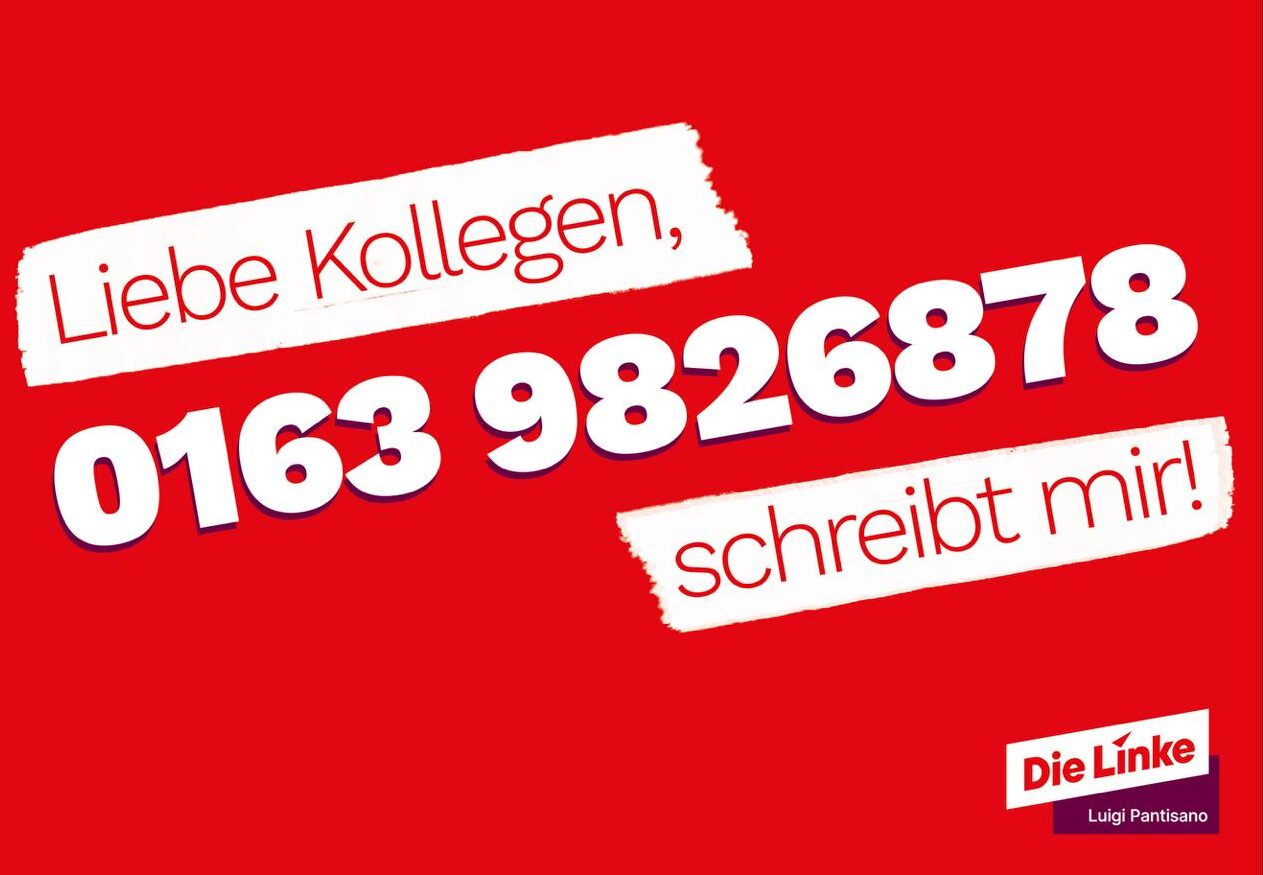 Schreibt mir auf WhatsApp: Was ist deine Aufgabe? Was macht dich wütend? Was macht dir Mut? Und natürlich: Was erwartest du von der Linken? Egal ob Kollege bei Bosch, Pflegerin im Klinikum und Mama in Teilzeit, schreibt mir und wir machen einen Videocall aus!